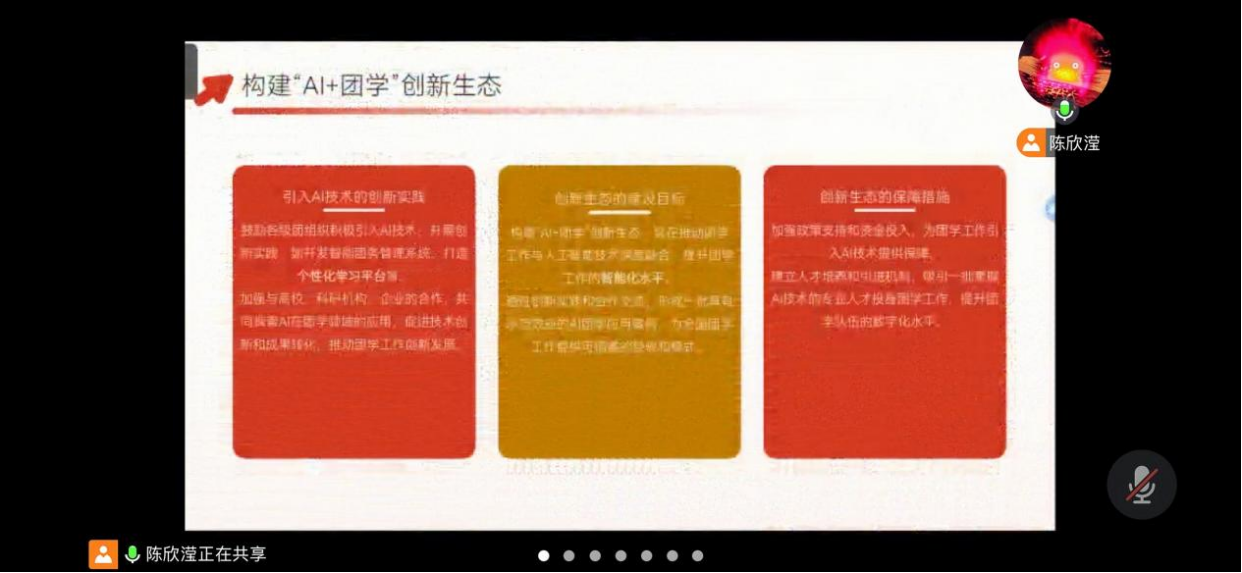 陈怡琳同学首先介绍了当前中国数字经济的发展规划要点,特别是《数字经济2024年工作要点》中提出的适度超前布局数字基础设施、加快构建数据基础制度等举措,为团学工作的数字化转型提供了政策指引与技术支持。随后,她强调AI赋能团员学习需要借助多种科技方法,如智能测评系统、自适应学习推荐模型和情感计算技术与动态模型等。其中情感计算技术与动态学习画像生成等智能评估手段能够为教学策略调整提供依据,大力提升学习效果。同时,AI赋能团学也面临许多挑战,包括数据安全与隐私保护、算法偏见治理机制以及技术伦理风险防控等问题。为此,两位同学提出了加强数据安全与隐私保护、建立算法偏见治理机制、提升团员和团干的数字素养等应对策略。陈欣滢展望未来,提出构建元宇宙团学空间、搭建区块链学习成果认证体系等创新设想,呼吁各级团组织积极拥抱 AI 技术,打造 “AI + 团学” 创新生态。