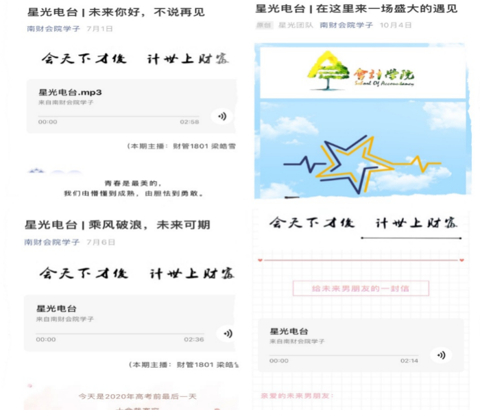 上线至今,“星光电台”针对老员工原生态家庭问题、人际关系,恋爱问题,自我成长,职业规划等热门问题,已分八期完成内容推送,以有声的方式“陪伴”和“倾听”,帮助同学们寻找自己的答案,探索自我成长的途径。其中,在“未来你好,不说再见”毕业季特辑中,毕业生纷纷暖心“告白”,借由电台的声音传递出自己的不舍和祝福,将一场离情依依的离别转变成对未来的期望。另外,“你.....要不要做我男朋友”的情感专题在同学中产生极大地反响,同学们纷纷转发,审计1902班吴仪同学表示:“我们受过这各种各样的教育,唯独缺少“爱”的教育,在电台中我们仿佛听到了自己的心声,找到了内心的共鸣,原来我们都是一样的在寻找真爱”。