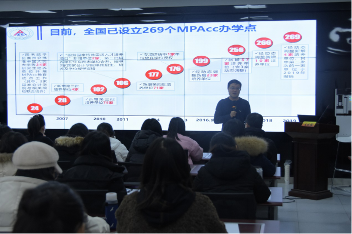 支晓强教授首先介绍了MPAcc教育的发展概况,并对目前国内高校的会计专硕的招生培养情况进行了总体分析。支教授重点介绍了MPAcc案例大赛的基本情况,对案例大赛的举办初衷和案例大赛的发展情况进行分析,并将整个大赛的工作总结为‘写’、‘教’、‘学’、‘赛’、‘建’五个部分,并对每个关键词分别进行了解释。在答疑环节,支教授对老师和同学们在MPAcc案例大赛参赛过程中的遇到问题给予详细的解答,支教授丰富的案例研究体会以及深入浅出,诙谐幽默的语言赢得了在场师生的一致认可。