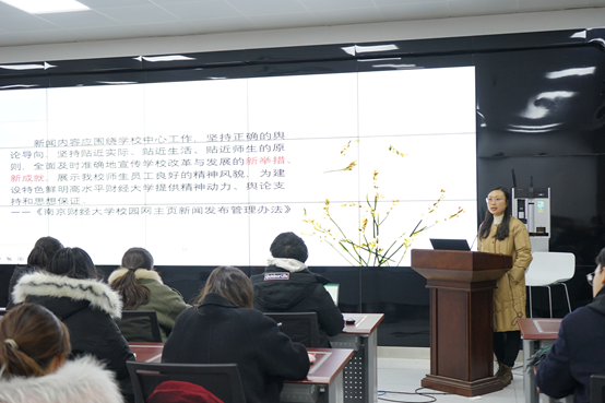施卫娟老师从内宣稿和外宣稿两个主要方面介绍了新闻写作技巧,为同学们讲解了南财新闻网栏目的设置、写作基本规范及常用的新闻报道“模板”。施卫娟老师将讲解重点放在了外宣稿方面,提出新闻稿写作需要新闻策划,主要在新闻“四季歌”(即新闻写作要抓住时机,捕捉热点)、特色品牌活动进行讲解,新闻“四季歌”主要指在主题节目、社会热点、政策文件等方面选取新闻选题,并列举了一系列具有代表性的特色品牌活动的新闻稿。最后详细为大家讲解了新闻稿每部分如何下笔,在遵循事实的基础上,如何写出特色与亮点,突出故事性,使新闻稿有理有据,富有艺术性与说服性。在讲解过程中,施卫娟老师娓娓道来,结合具体新闻稿范例,使讲解更加生动形象。