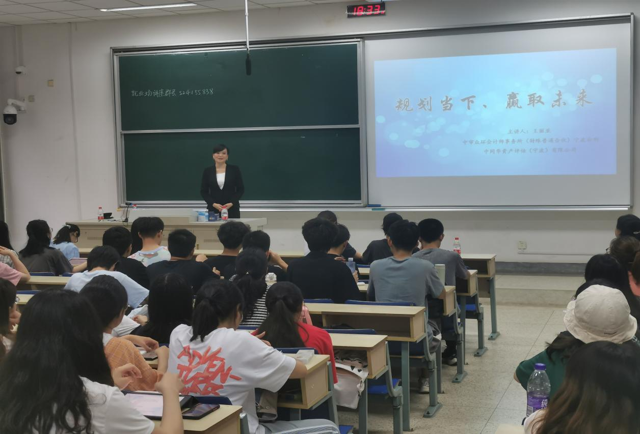 6月9日晚,宁波市会计学会副秘书长、宁波市会计学会会计领军人才委员会委员王丽亚应邀在德济楼117作就业指导专题讲座。