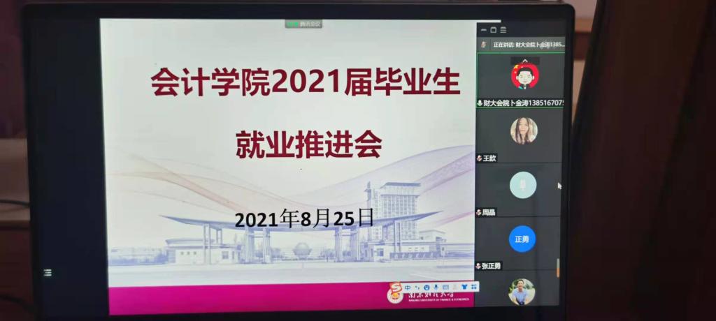 刘颖副书记通报了2021届研究生和本科生的最新就业情况;2021届毕业班辅导汇报了所带班级的就业情况及提高就业率的相关举措;会计学系主任韩小芳、财务管理系主任胡建雄、审计学系主任朱海、资产评估系主任刘小峰分别汇报了各专业就业工作推进情况,提出了建设性的意见和建议。