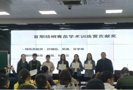 开营仪式的第二部分是由沈经理揭晓本次“梧桐青苗”学术训练营的主题标志,并为大家详细介绍梧桐青苗学术训练营的内涵和构想。随后,公司为参与设计此次训练营标志孙靖晗、吴倩、吴宇希三位同学颁发特别贡献奖,为参与组织的刘昊和朱桐霏同学颁发组织贡献奖。
