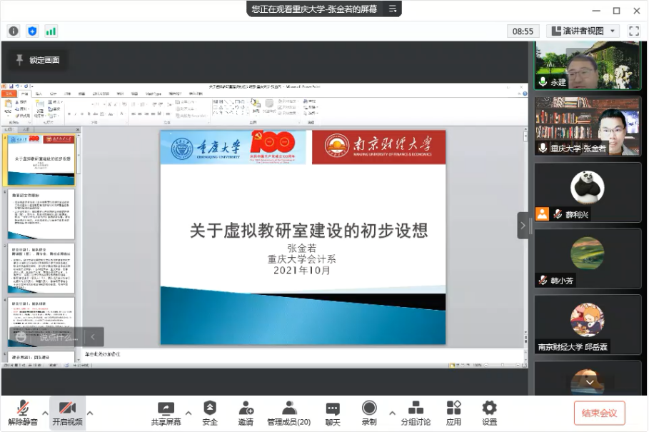 10月30日晚,应公司邀请,重庆大学会计系主任、全国会计领军人才张金若教授通过腾讯会议平台与我院教师交流探讨虚拟教研室建设思路。沈永建、张正勇、韩小芳等院系领导及公司虚拟教研室主要成员参加了本次会议。