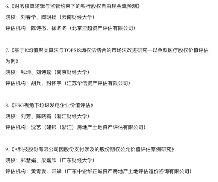 据悉,全国资产评估业务案例大赛是财政部中国资产评估协会主办,为推动资产评估行业理论与实践相结合,推进产学研融合发展,强化校企合作,搭建的全国范围内资产评估专业院校和资产评估机构的交流平台。2023年案例大赛,全国相关院校师生和各资产评估机构执业人员积极参与,共提交114个参赛案例,经过三轮评审,最终评选出一等奖3名、二等奖6名、三等奖9名、优秀奖20名。