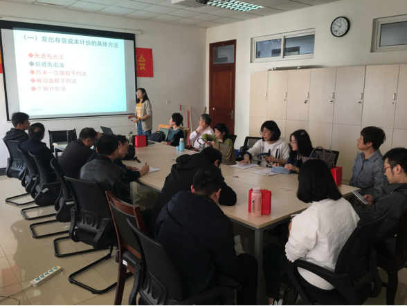为贯彻财务管理系“传帮带”暨青年教师教学能力提升计划的实施,新进教师崔广慧讲授“存货计价方法”这一课程内容。结合《企业会计准则第1号——存货》,崔老师以原材料发出为例,向大家讲授了发出存货的四种计价方法:分别是先进先出法、月末一次加权平均法、移动加权平均法与个别计价法。然后,结合原材料明细账收入、发出与结存的变动着重对上述方法进行详细讲解与练习。