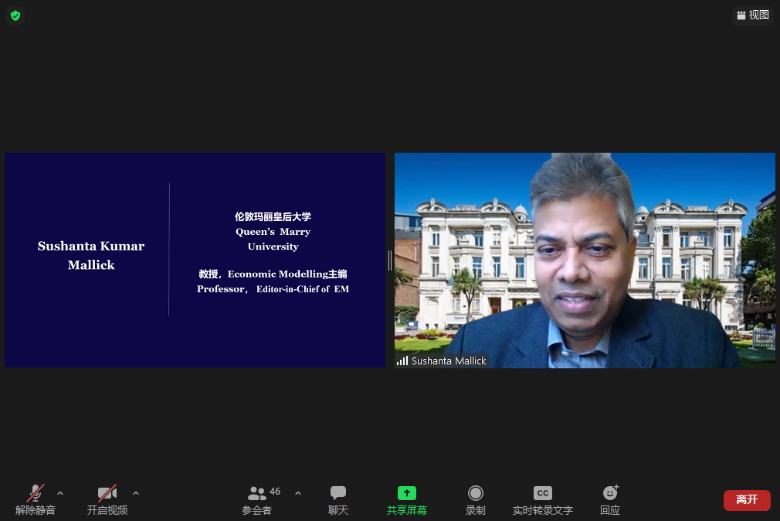 第四个部分是研讨会为了促进与会学者与报告者的交流沟通,在演讲结束后进行了期刊主编沙龙环节。与会学者们积极提问,Paresh Kumar Narayan、Sushanta Mallick和Brian Lucey教授耐心且详细地解答了各位学者的疑问并提出了自己的看法和诚恳的建议,将研讨会气氛推向高潮。