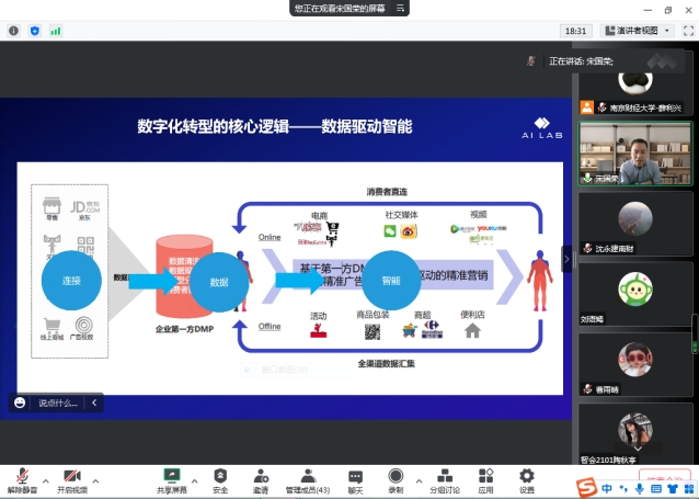 宋国荣首先介绍了当前我们所处的时代背景,分析了数字化转型的核心逻辑——数据驱动智能;随后,详细论述了数智时代会计发展的新机遇,并详细列举了数智技术在企业方方面面的应用实例;最后,分享了未来会计人才的能力需求及发展机遇。报告内容丰富,讲解细致,得到了师生们的一致好评。