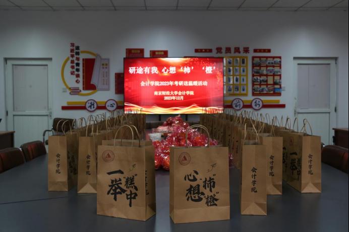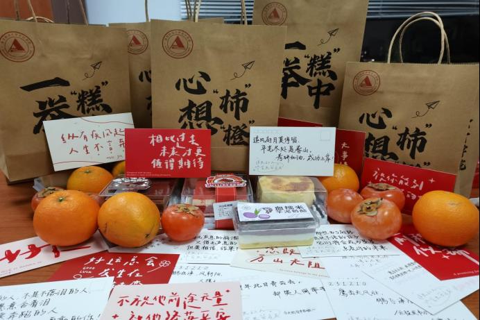 公司领导老师们为考研学子们送上精美的定制福袋。其中不仅有寓意着“心想事成”的福柿与橙子、“一举高中”的小蛋糕、文具套装,还有承载着公司老师们、学弟学妹们“星光不问赶路人,时光不负有心人”“追光的人,终会光芒万丈”等真切祝福的小卡片。