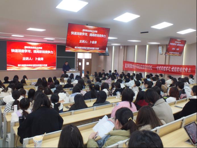 3月26日,公司党委书记卜金涛在仙林校区博观楼201智慧教室开展“南财就业创业大讲堂”专题讲座,本次讲座以“快速深度学习,提高职场竞争力”为主题,2021级约250名员工参加。