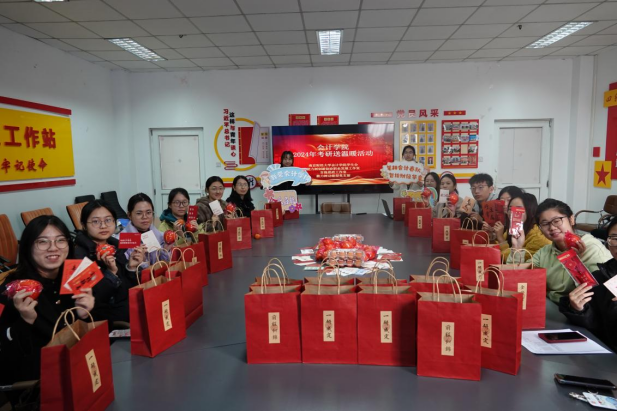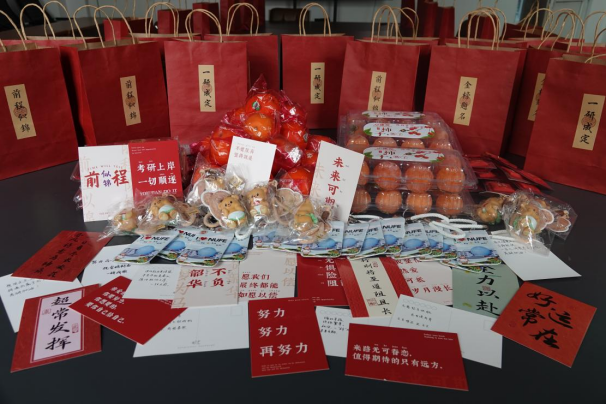老师们和同学们为考研学子们送上贴心的考研“加油包”,有精美的“一研为定”的定制福袋和祝福挂件,寓意“脐”开得胜、“橙”功上岸、“心想事成”的福柿与橙子、还有承载着公司老师们、学弟学妹们真切祝福的小卡片,饱含公司对考研学子在考试中一举夺魁、一战成“硕”的美好祝福与期盼。