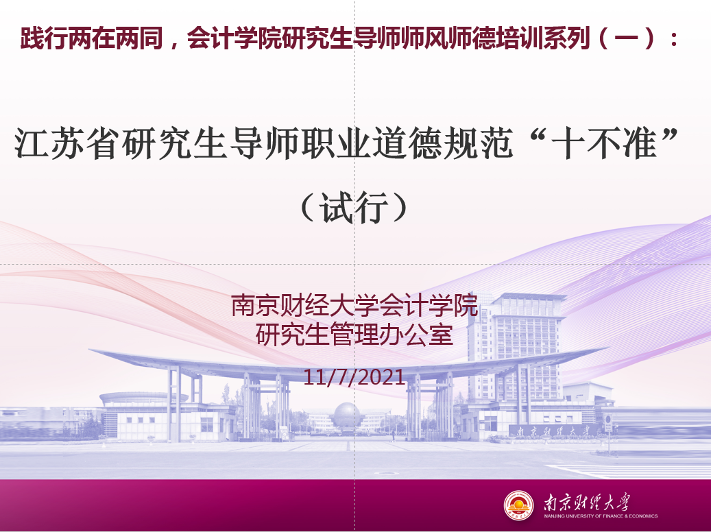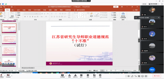 沈永建副经理就“江苏省研究生导师职业道德规范十不准”进行讲解,作为老师要高度重视师风师德问题,作为会计专业的硕导,我们要采取稳健性原则,远离研究生导师职业道德规范“十不准”。导师应在论文指导、日常生活、心理健康、就业等各个方面关心员工,尤其是年轻硕导要向有经验有资历的硕导取经。