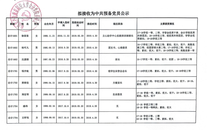 以上同学经党组织培育、考察,准备近期发展为中国共产党预备党员。为了广泛听取群众意见,接受群众的监督,现予以公示,公示时间时间为5天,有情况可在公示期内向公司党委(党总支)反映。联系电话:86718285,徐老师。