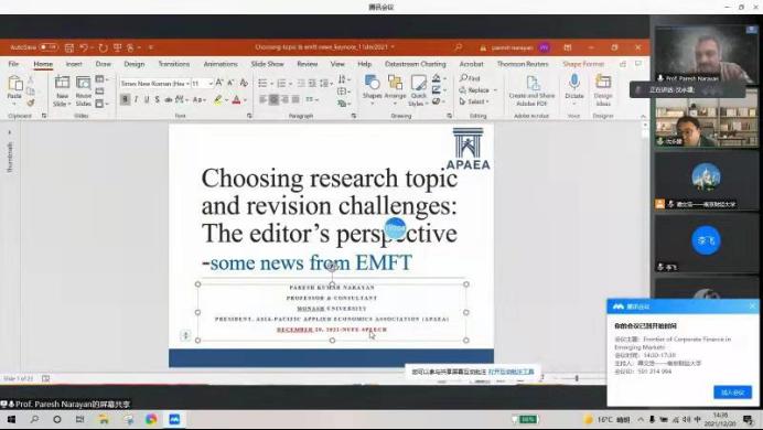 Paresh Kumar Narayan教授本次讲座的主题是“Choosing Research Topic and Revision Challenges: The Editor’s Perspective”。围绕公司财务学科的前沿选题,他从编辑的角度来看如何选择有趣又兼具学术价值的学术命题,以及如何通过表达来实现最终的发表。在讲座中,Paresh Kumar Narayan教授围绕“什么是好的研究命题、如何讲好学术故事、如何体现研究贡献”这三个重要的话题,结合具体的研究选题进行阐述。他利用生动的详实案例,譬如新冠疫情、气候变化、经济政策、能源环境、社会网络、智能信息技术、大数据等,阐述了这些背景下公司财务受到的挑战和应对策略都是非常有价值的学术选题。